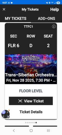 Two tickets for Friday November 28th on the floor at Golden One in Sacramento. The tickets are for the 7:30 show