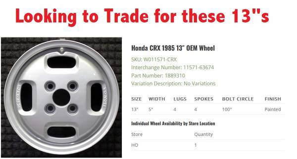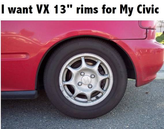 I am looking to buy some 13" Civic rims, known as VX 13" Alloy rims. I would also be interested in some other rim styles that are 13", but those are not really what I am looking for.