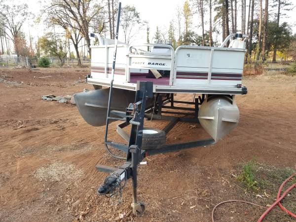 Motor recently checked out, new bimini, new upholstery, 1" bimini frame that folds down and large 24" pontoons. Minor repairs after partial burn in Camp Fire.