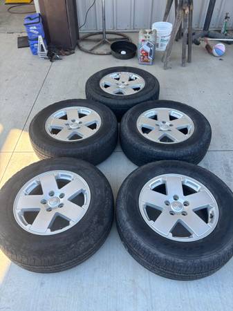 2012 Jeep Wrangler rims and tires. 5 total. Goodyear year Wrangler tires. Have about 4/32 left on them. Maybe 10,000 miles. Rims are in good shape. Spare has a couple scratches on it. Tires all hold air. No leaks. Tires were just balanced.