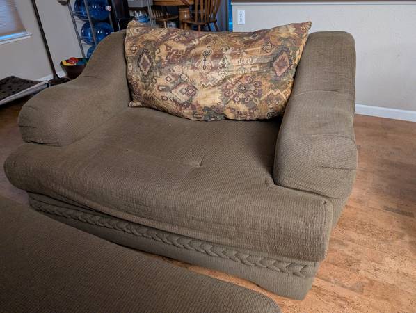 Oversized chair and ottoman. Has been in a clean smoke free home since purchased. Main seat and side cushions re -stuffed a few years ago. We do have a short hair dog, but accidents or chew marks....