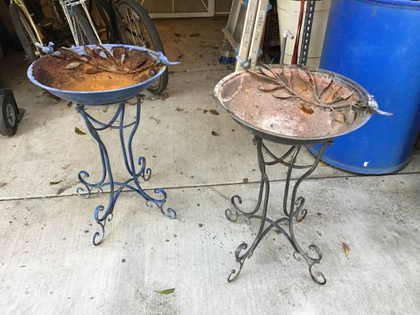 Free , two metal bird baths ,30” tall . Bowls need cleaning , , this is a land line and doesn’t text,so please call.